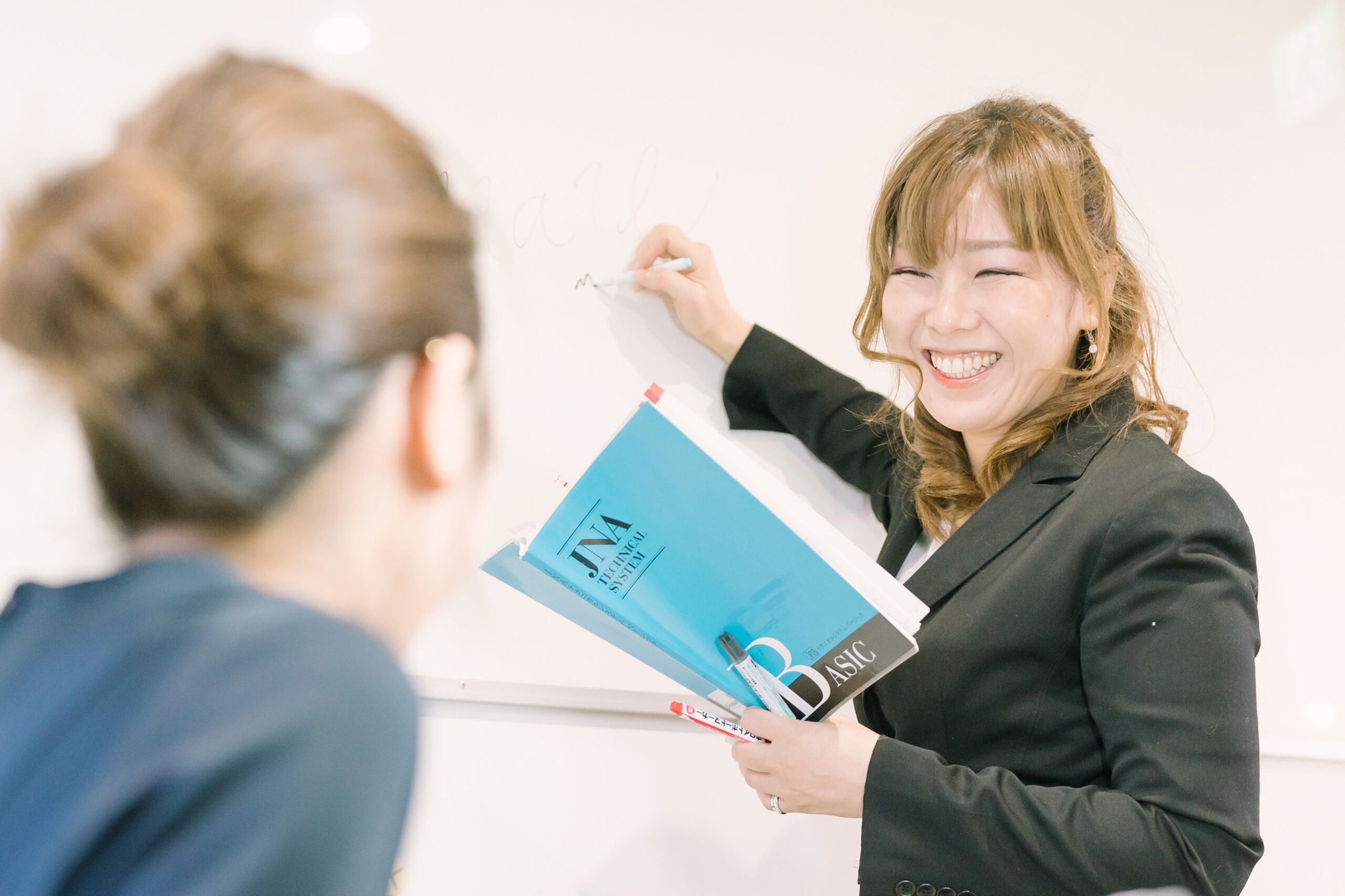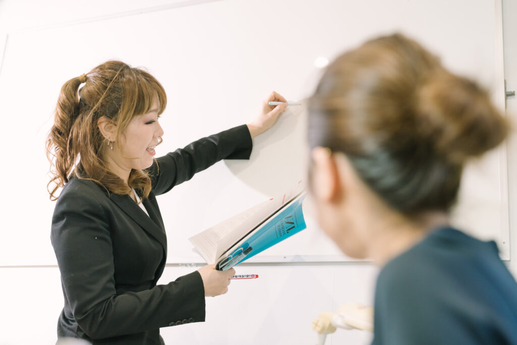 ネイル教室に設置されたホワイトボードを使用して、講義が行われます。