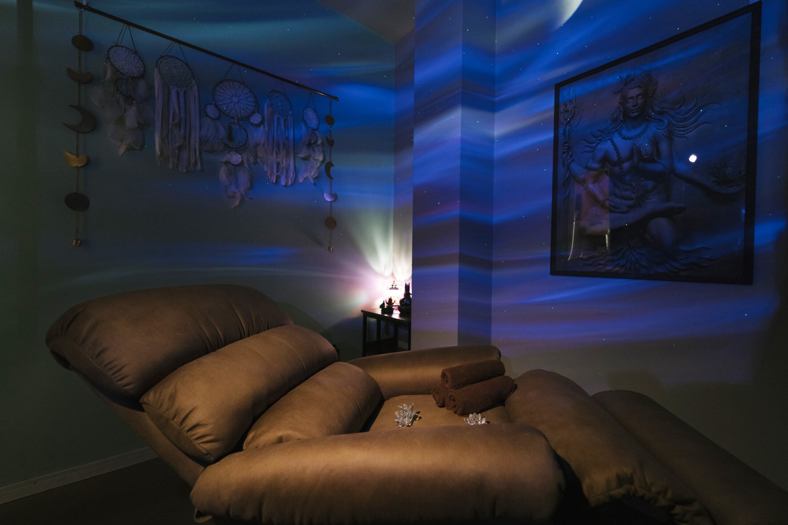 アーユルヴェーダの施術に必要な設備を完備し、伝統的な技術を実践的に学べる幻想的な部屋です。