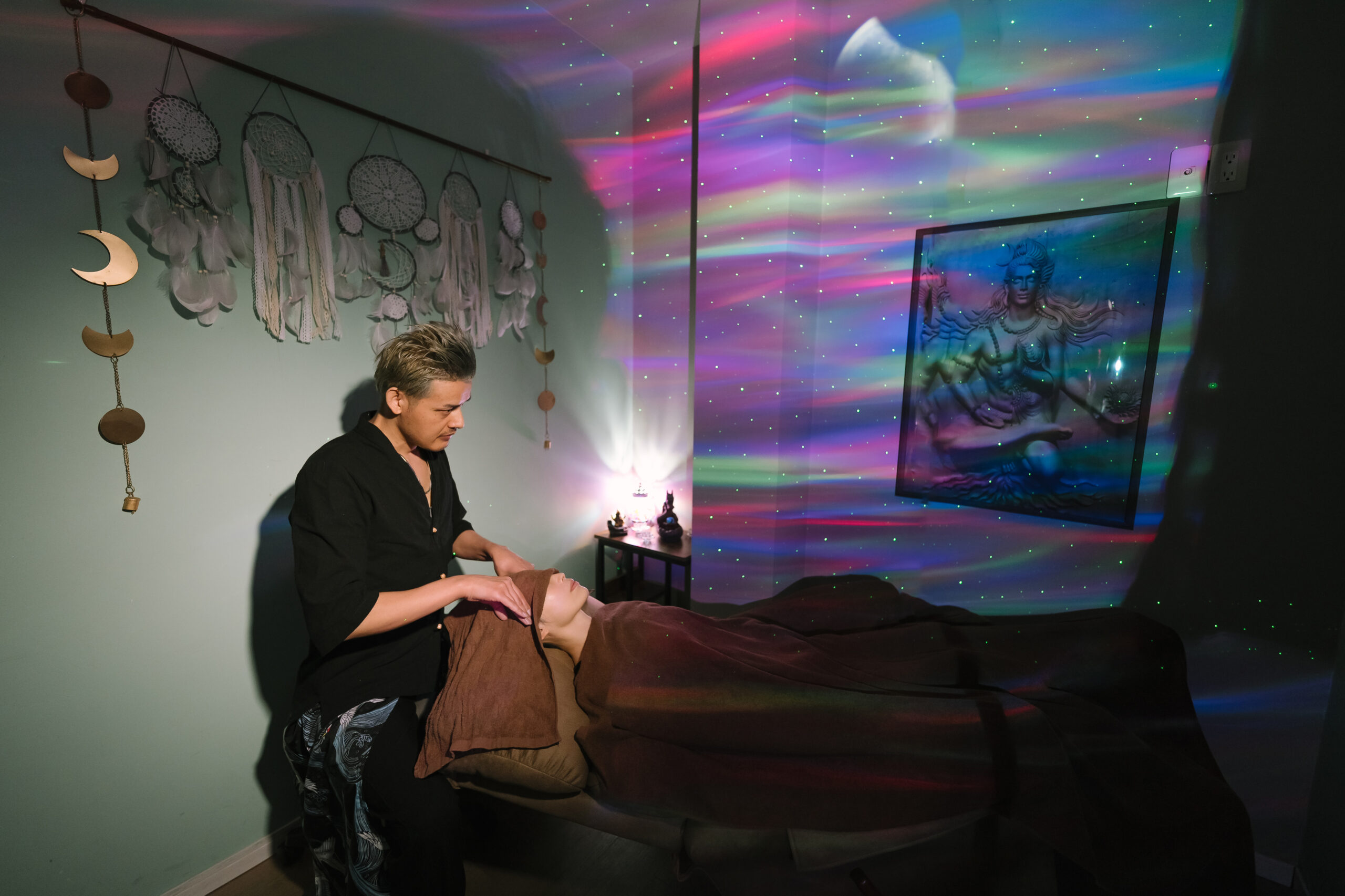 夜空を映し出す幻想的な照明と、優しい月の光が心を穏やかにする空間を演出。壁にはインドの神シヴァ神の絵が描かれ、神秘的な雰囲気を体感していただけます。さらに、空間に漂うアロマの香りが五感を満たし、深いリラクゼーションをお届けします。