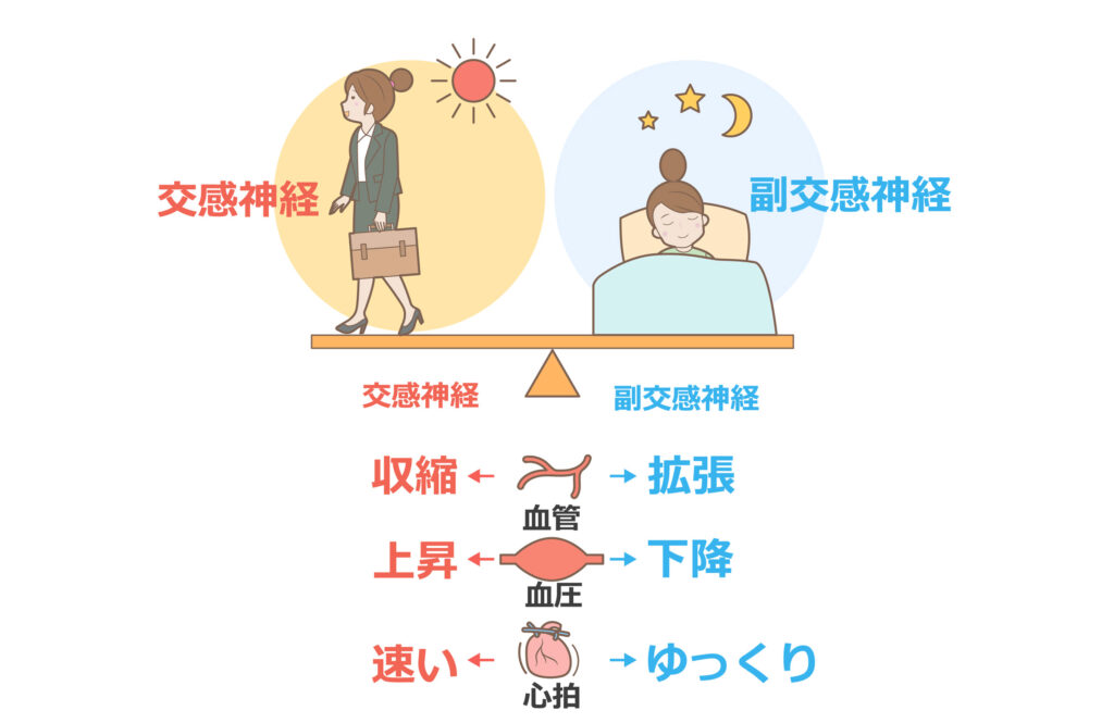 ・交感神経: 活動時に働く神経で、心拍数や血圧を上げ、体をエネルギー消費モードに切り替えます。集中力を高めたり、身体を動かす準備を整える役割があります。