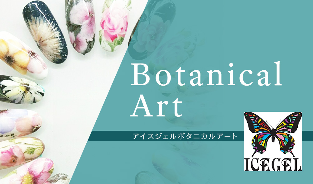 《アイスジェルの水彩画風のネイルアート用に開発された ICEGEL ボタニカルシリーズBT01~BT12の特長や使い方などの解説と、3パターンのアートテクニックを勉強します。》
