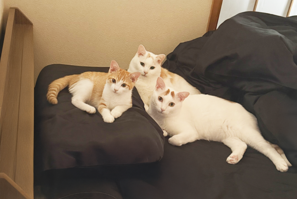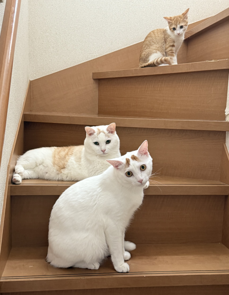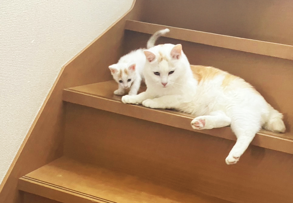 さらにその後、チョコちゃんは家族に見守られながら15歳で天寿を全うしました。その頃、資材置き場で「子猫が生まれてしまって困っている」という話を聞き、どうしても放っておけず、その中の1匹を保護することにしました。その子はルクちゃんとまるで親子のように寄り添い合い、シュガーちゃんと名付けられました。